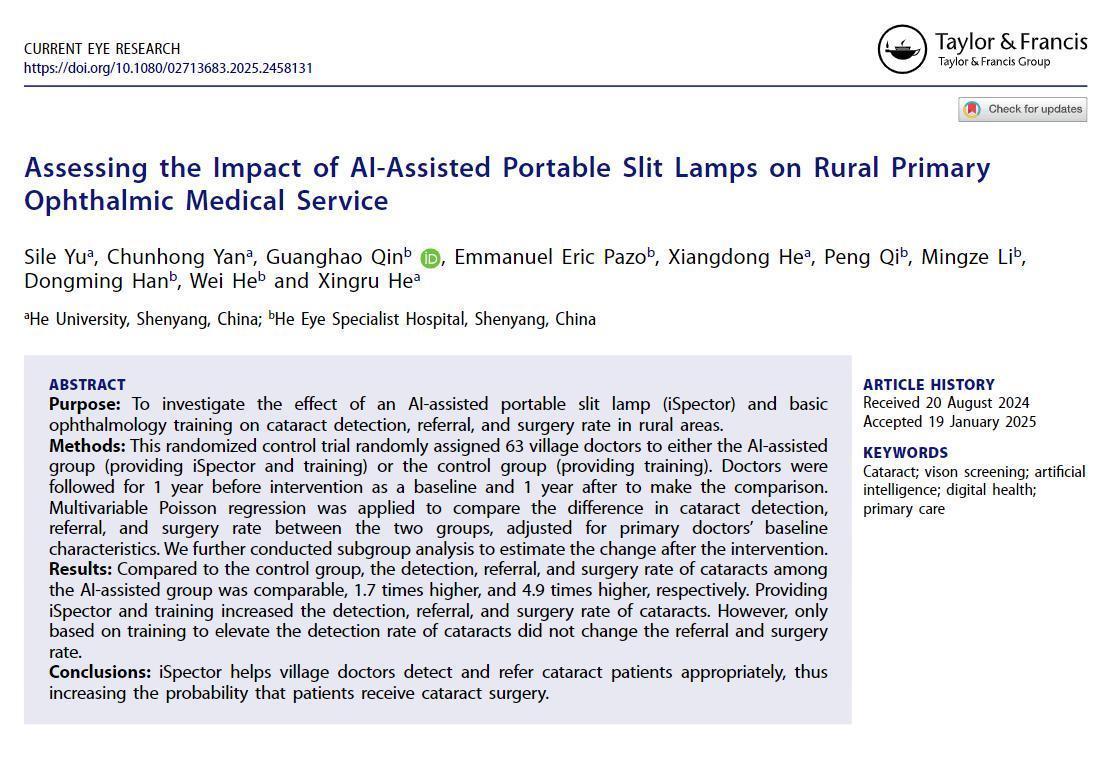 近日,辽宁何氏医学院副校长、公共卫生学院院长余斯乐团队在《Current Eye Research》发表了题为“评估人工智能辅助便携式裂隙灯对农村基层眼科医疗服务的影响”的研究成果。该研究成果不仅揭示了人工智能辅助设备在基层眼科医疗中的巨大潜力,更为资源匮乏地区的白内障筛查提供了创新解决方案。